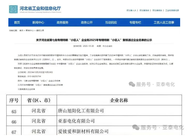 近日,河北省工業(yè)和信息化廳發(fā)布關(guān)于河北省第七批專精特新“小巨人”企業(yè)和2025年專精特新“小巨人”復(fù)核通過的企業(yè)名單,亞泰電化有限公司作為第四批認(rèn)定的專精特新“小巨人”企業(yè),憑借在細(xì)分領(lǐng)域的不斷積累與持續(xù)創(chuàng)新能力,順利通過2025年專精特新“小巨人”企業(yè)復(fù)核認(rèn)定。此次復(fù)審?fù)ㄟ^,標(biāo)志著公司在專業(yè)化發(fā)展、技術(shù)創(chuàng)新實(shí)力與未來成長(zhǎng)潛力方面獲得了長(zhǎng)足的進(jìn)步,即是對(duì)企業(yè)以往成績(jī)的肯定,也是對(duì)未來企業(yè)發(fā)展的鞭策。